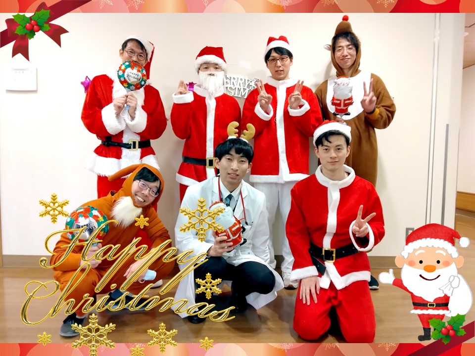 4名の研修医達が変身すると気分はすっかりクリスマス気分♪これならお子さん達も喜ぶかなっと思います☆