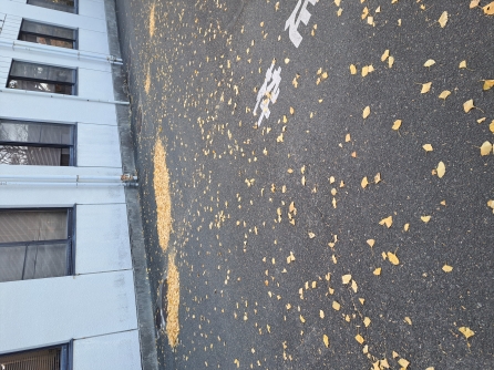 2週間後の12/9、駐車場は落ち葉が積もっていました。銀杏の紅葉はそろそろ終わりですがまだまだ周辺はきれいな木がたくさんあります。出勤途中の少しの時間でも秋を楽しみたいと思います。