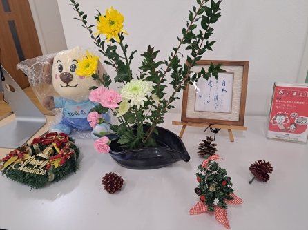 院長と事務長と3人で、院内、おおぞら療育センター、ベテルホームに年末のご挨拶にまわりました。これは先日クリスマスに撮ったベテルホームの受け付けの飾りです。