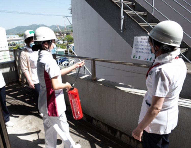 新人職員及び中途採用職員向けの防災訓練を、4月18日(木)~19日(金)にかけて行いました。 始めに講義形式で災害発生時の病院職員としての役割、当院の防災体制について学びました。 講義修了後、グループに別れて規律訓練を行い、災害時の報告の仕方や重要性について学びました。 実技訓練では、消火器や消火栓の取り扱い、担架を使用しての搬送を実践しました。「病院職員として災害対策・災害対応の大切さを理解し、実災害への対策・対応を習得する」をテーマに、先輩職員の指導のもと積極的に取り組み、実り多い訓練となりました。