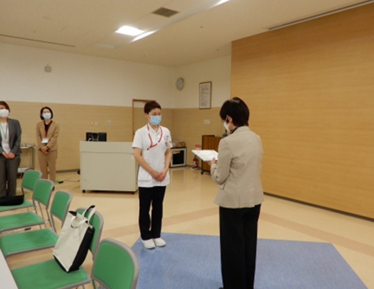 いくつかの看護基礎教育課程の実習を受けています。その関係から臨床教授等の称号をいただいています。先日は豊橋創造大学、本日は看護課長会に聖隷クリストファー大学の先生方が来ていただき授与式を行いました。今年度は課長代行で参加していたT係長が代表でいただきました。