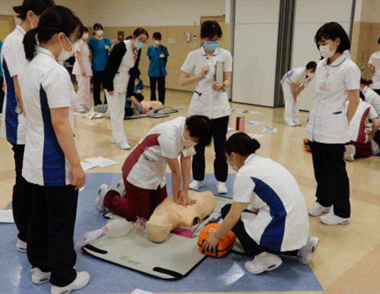 5日目!まだまだ研修は続きます。今日は一次救命救急処置、BLSの研修です。 1グループ1~5人に分かれ各班インストラクターが付き、最終試験に合格するまで行いました。