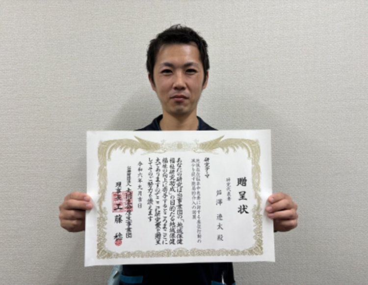 リハビリテーション部 理学療法士 芦澤 遼太(あしざわ りょうた)さんが大同生命厚生事業団による助成事業で、「地域保健福祉研究助成」の対象者に選ばれました。 この事業は、地域に密着した保健・医療に関する助成で、ボランティア活動などを支援し、活性化や継続につなげる目的で、「地域保健福祉研究助成」部門と「ボランティア活動助成」の2部門がある中、芦澤さんは「地域保健福祉研究助成」部門の対象者に選ばれました。 脳卒中の患者さんの再発は介護負担の増加に繋がるため、介護予防の観点から再発予防が求められています。今回の研究のテーマは「地域在住脳卒中患者に対する座位行動の減少を促す簡易的介入の効果」で