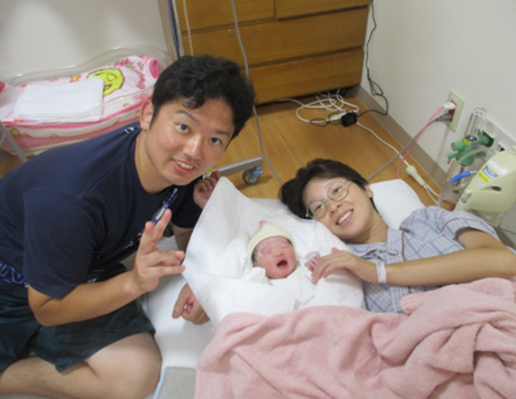 朝から陣痛が急に強くなりたんぽぽに行きました。 優しいパパが付き添って背もたれになってくれたり団扇で扇いでくれたり、とても協力的でしたね!赤ちゃんもがんばって頭をのばして産道を通って産まれてきてくれました(^o^)! ママは医師のブロック注射が効き、とても上手にお産をされました。 新しい家族が増え一層楽しくなりそうですね♪ ご出産おめでとうございます。