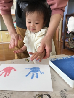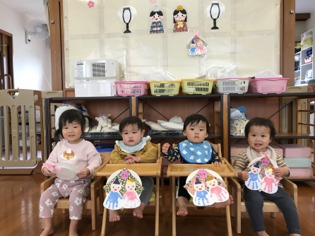 3月3日はひなまつり。みんなでひなまつりの飾りを作りました!今回はスタンプ台を使い、自分の手のひらをペタリ。手を大きく開いて、上手に手型をとることができました。手型は、まるでおひなさまとおだいりさまの着物のよう!「かわいくできたね!」とお友達と話しながら、思い思いに楽しんでいました。色とりどりの飾りが完成し、園内がひなまつりの雰囲気でいっぱいになりました。