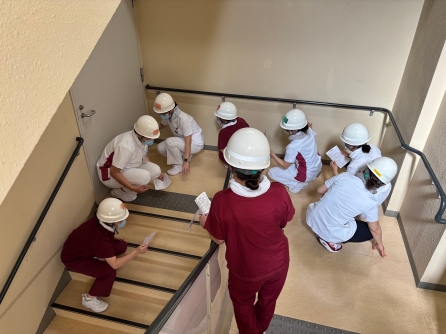停電時などエレベーターが使えない場合を想定し、患者さん役を誘導。「声かけ」や「歩幅への配慮」など、実際の対応に即した学びを得ました。