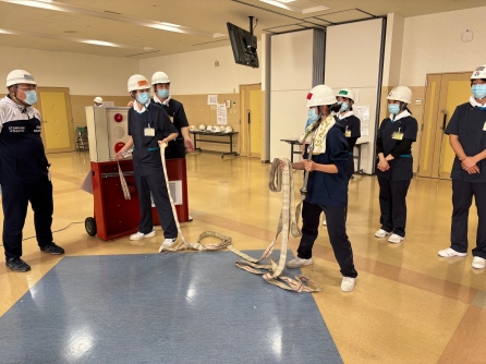 災害時は、迅速かつ的確な行動が求められます。新人職員たちは真剣な表情で訓練に取り組み、「自分が患者さんを守る立場」であることを実感していました。