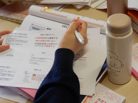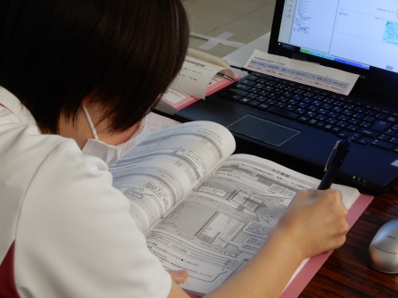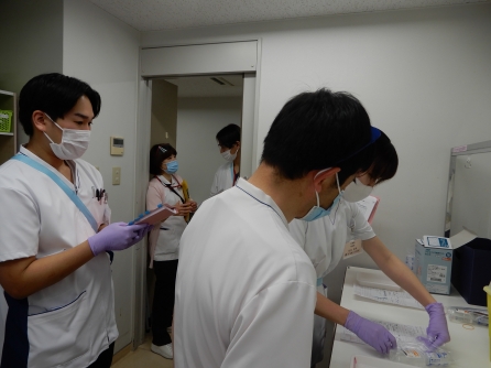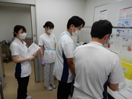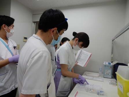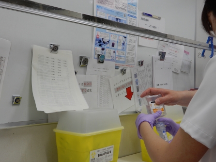 注射せんをみて確認する方法、中央研修で学んだことが活かされます。指さし確認、しっかりできています。