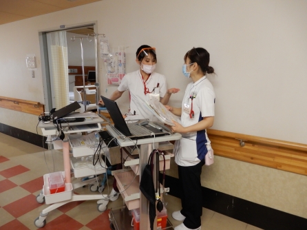 病室に入る前に段取りの最終確認です。退院前の関わりはとっても大事で難しい看護だと思います。1つ1つ覚えていきましょう。