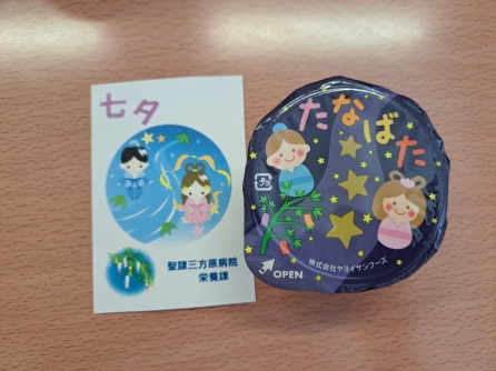 7月7日のお昼は七夕メニューです。七夕そうめんは桃色のめんが入り、具はたまご、かまぼこ、おくら、星形にんじんなど色鮮やか。挽肉と野菜の煮物でボリューム出し、かわいいデザートとカード付です。ちょうど検食で楽しくいただきました。患者さんに少しでも季節を感じてもらえたらと思います。栄養課さんありがとうございます。