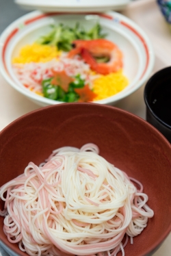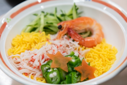 海老、きゅうり、錦糸玉子、カニかまぼこ、オクラ、星型に型抜きされた人参添えました。見た目にも涼やかで、季節を感じていただける一品です。