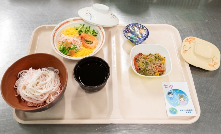 7月7日の七夕には星に願いをこめる七夕飾りをイメージした献立で、涼やかな夏の訪れを感じていただける行事食をお届けしました。