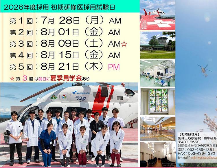 本日は『2026年度採用初期研修医 試験(予定)』のご案内です。 詳細につきましては初期研修医募集要項にて、順次病院HP上でご案内して参ります。 試験日程は状況により変更することがございます。何卒ご了承ください。