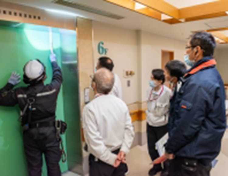 3月6日に施設課の職員が「エレベーター閉じ込め時救出講習」を受講しました。 当院ではエレベーターの定期メンテナンスを3ヶ月ごとに実施していますが、この講習は年1回を目安に実施しています。 一般的にエレベーターは何らかの理由で停止した場合は、一番近くの階に移動して停止・ドアが開く設定です。この講習は、エレベーターの故障等でドアが開かなかった場合に、なかに残された人の救出手順を確認するというものです。原則として専門業者が迅速に駆けつけて対応することになっていますが、医療的な処置が必要な方がいて一刻を争う場合には、この講習を受けた職員が対応します。 より確実に、そして安全な病院施設の運営の