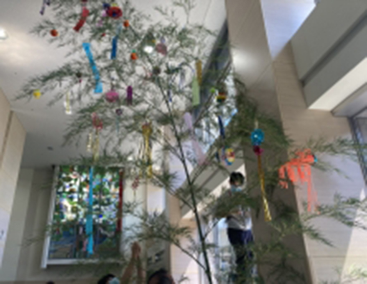 病院正面玄関とF号館エスカレーター前に、七夕飾りを設置しました。 色とりどりの短冊と笹の葉が季節の彩りを添え、来院される皆さまをやさしくお迎えしています。 短冊は笹の木の近くにご用意していますので、どなたでも自由に願いごとを書いていただけます。 「早く元気になりますように」「家族みんなが健康で過ごせますように」など、心を込めてつづられた言葉が、笹の葉をやさしく揺らしています。 ご来院の祭は、ぜひ一枚の短冊に願いを込めて、季節の行事を一緒に楽しんでみませんか。