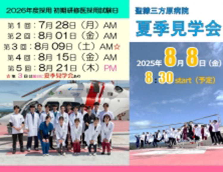 本日6/12(木)より 2026年度採用 初期臨床研修医採用試験と2025年度夏季病院見学会の 申込受付を開始致しました! 参加をご希望の方は以下添付の画像をクリックいただき、 お申込みフォームから参加申込をお願い致します。 より多くの医学生さんの応募をお待ちしております!