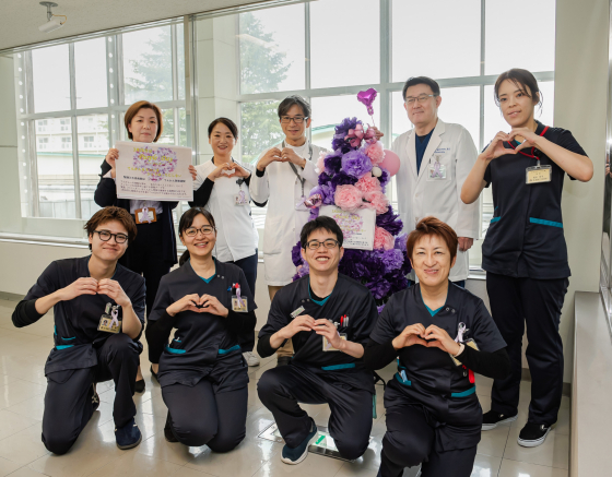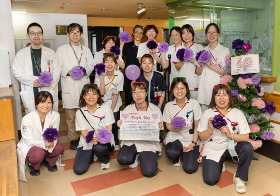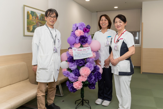 また、窓口職員や関係診療科の医師、看護師をはじめとするスタッフも、名札に「パープルリボン」を着用し、来院される皆さまにさりげなく啓発のメッセージをお届けしました。