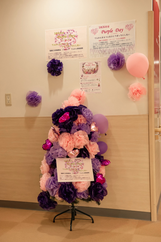 期間中は、玄関ロビーや関係外来、病棟に「紫色のツリー(啓発ツリー)」を設置し、紫色のリボンや装飾で彩りました。これらの装飾は、病院ボランティアの皆さまにご協力いただき、一つひとつ丁寧に作成していただいたものです。