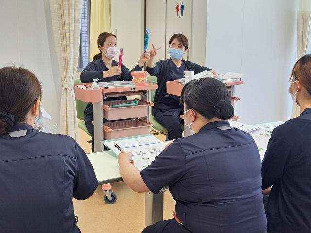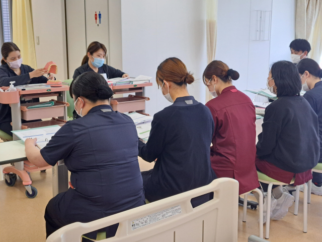 こちらは看護補助者研修。看護補助者のリーダー2人が中心となって進めます。まずは、口腔ケアから。モデルを使い、実際にお互いに演習もします。