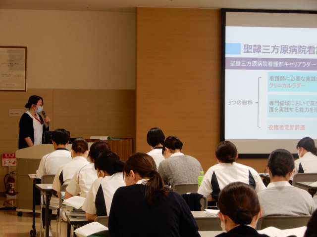 4月3日からは各部門のオリエンテーションが始まりました。3日は看護部は看護職と看護補助者・保育士、既卒採用者と分かれての集合研修を行いました。