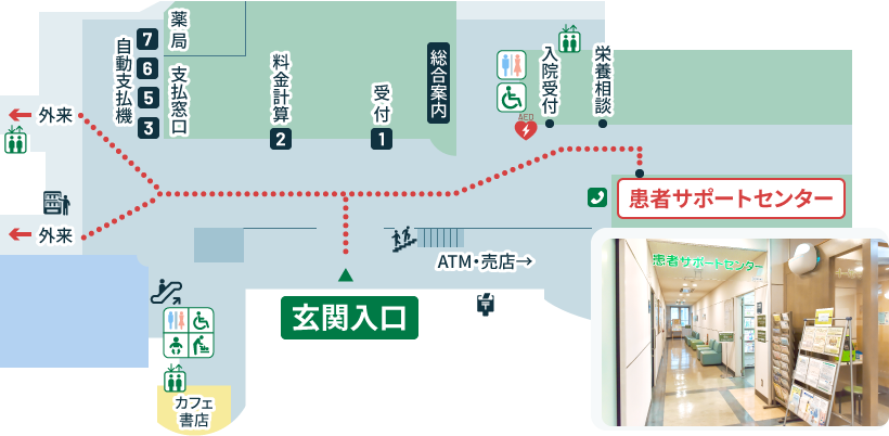 患者サポートセンターは、患者さまや地域の皆さま、関係機関からの医療、看護、介護、福祉に関わるご相談や問い合わせの窓口です。