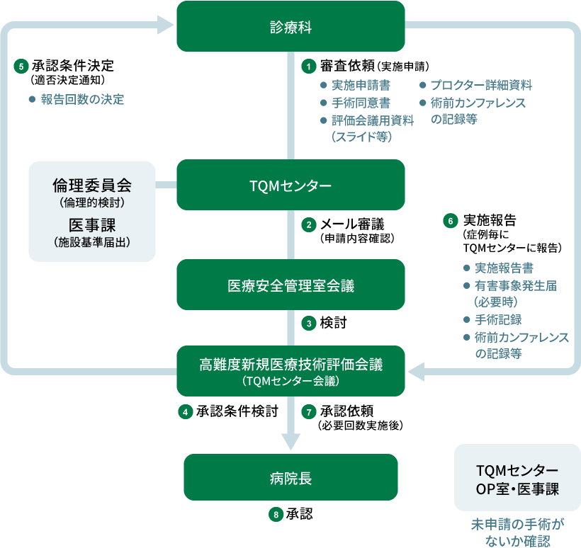 高難度新規医療技術とは、当院で実施したことのない医療技術(軽微な術式変更等を除く)であって、その実施により患者の死亡その他重大な影響が想定されるものです。当院では、患者さんの安全を担保するためにも、これらを実施する際はTQMセンターで実施の可否を検討する体制を整備しています。