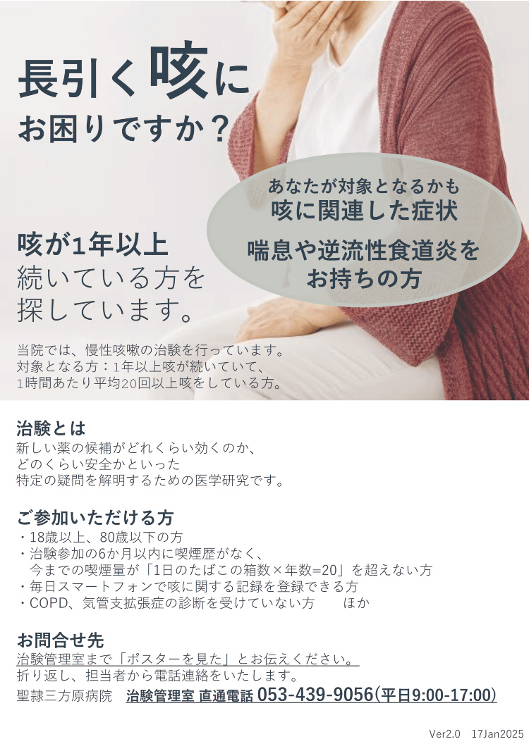当院では、現在、慢性咳嗽の患者さんを対象とした治験の参加者を募集しています。