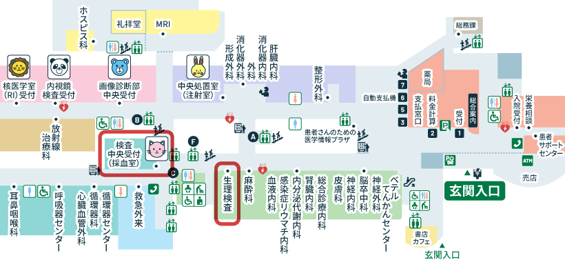 - C棟1階:検査中央受付(採血室)