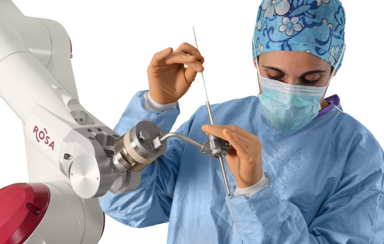 手術当日はロボットがその計画に沿って、電極を高い精度で脳内の狙った位置へ導きます。