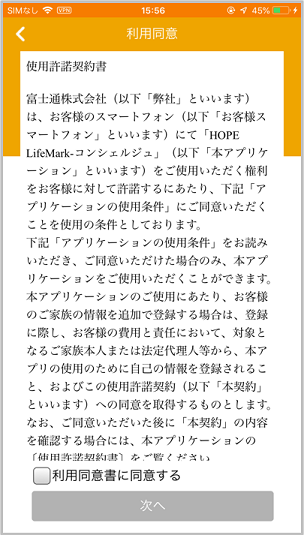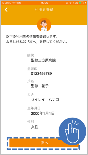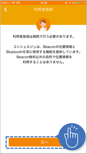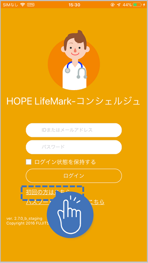 ①アプリを起動し、「初回の方はこちら」をタップします。