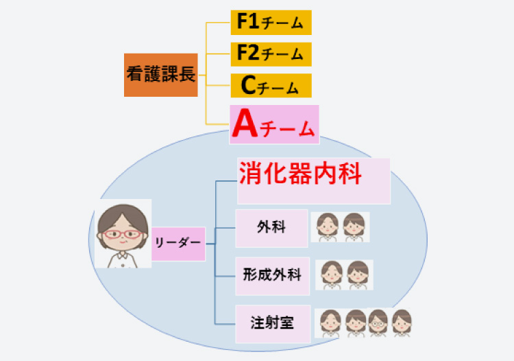 各診療科に配置している看護師1~3名と看護チームが協力、補完し合い看護実践します。