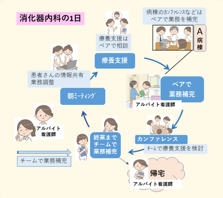 - 診療科に配置する看護師ペアが協力して業務を行ないます