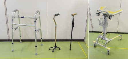 対象者の歩行能力に応じて、伺や歩行器、下肢装具といった歩行補助具を使用し、歩行能力の向上を目指してリハビリテーションを進めていきます。