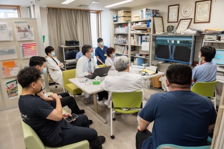 大動脈弁狭窄症は心臓と大動脈の間にある大動脈弁の開きが悪くなる弁疾患です。高齢の患者さんに対しては大動脈弁置換術という外科的手術(胸を切って心臓を止めて新しい弁を入れ替える手術)ではなく、胸を切らないでカテーテルを使って行う侵襲度の低い経皮的大動脈弁置換術(TAVI:タビ)を行っています。循環器科医師の他、心臓血管外科医、麻酔科医、看護師、臨床工学技師、放射線技師、生理検査技師とともに多職種でハートチームカンファレンスを行い、患者さんに対して最善の治療方法を検討しています。