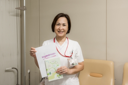 外来では、乳がんを知ってもらうためにパンフレットの活用や、入院ではオリジナルの「乳がんの治療をされた方へ」のパンフレットを使用して、患者さん一人一人に合わせた生活支援を行っています。