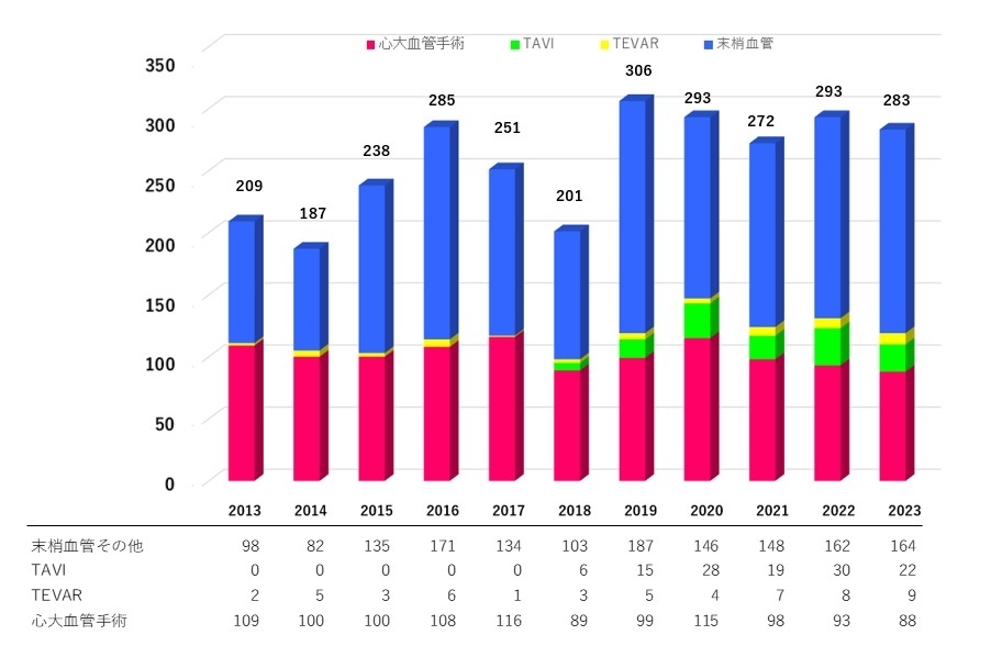 当科はEVAR、TEVARなどのステントグラフト治療、大動脈弁狭窄症に対する治療として標準的(外科的)大動脈弁置換術(SAVR)、低侵襲(小切開)大動脈弁置換術(MICS AVR)、経カテーテル的大動脈弁置換術(TAVI)、また末梢血管治療はハイブリッド手術室で施行しております。当院で採用している透視装置はSiemens ARTIS phenoで様々なStructural heart diseaseに対応可能です。加えて今後は人工心肺装置HASⅢの導入を予定しております。その他僧帽弁閉鎖不全症に対しては僧帽弁形成術を行っております。術後はsurgical ICU(8床)、その他にもemergent ICU 8床、Pediatric ICU 6床、CCU8床での病棟管理にも携わっていただきます。