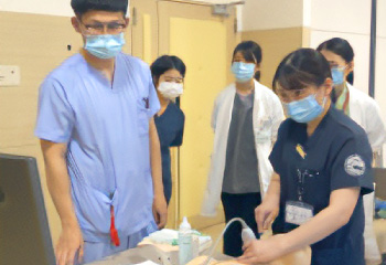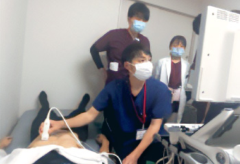 臨床検査技師によるレクチャーです。導入から始まり、腹部(内容は自由)と心臓(内容は自由)の研修を行います。