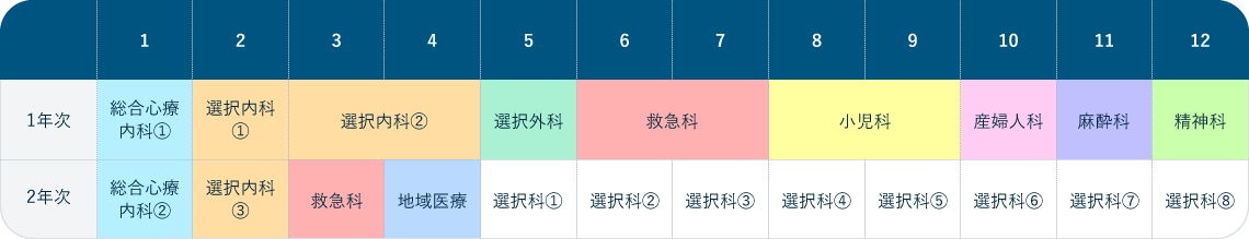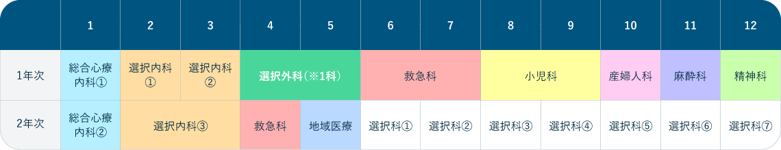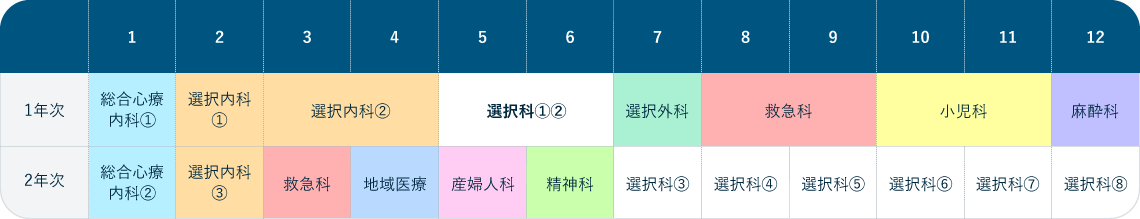 (4週×2科、8週×1科) - 希望により1年目から選択外科期間を4週から8週へ変更することも可能です。