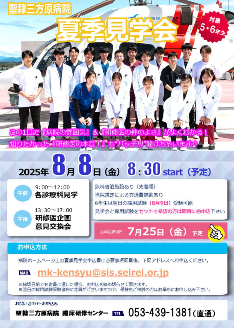 | お申込方法 | 夏季見学会申込書に必要事項を記載のうえ、メール(mk-kensyu@sis.seirei.or.jp)でお申込みください。 |