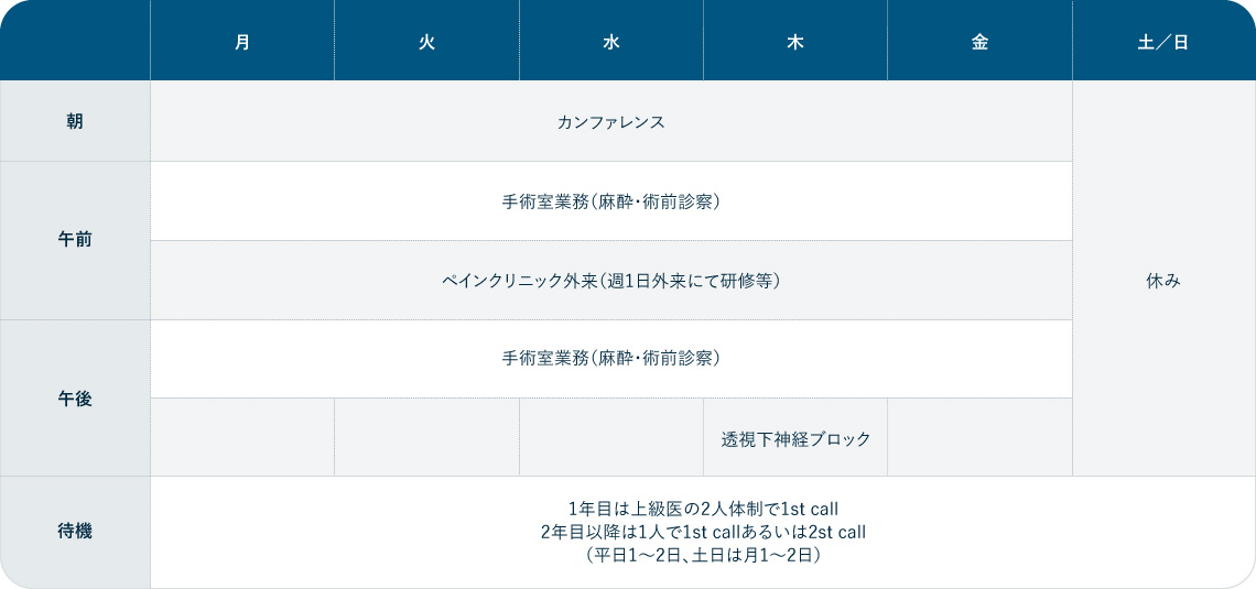年間 3000 症例に迫る周術期管理かつ、ペインクリニック、緩和ケア医療も積極的に行っている。症例は心臓血管外科、呼吸器外科、消化器外科、整形外科など様々であり、泌尿器科の Da Vinci 手術麻酔や、ドクターヘリを擁した三次救急から救急症例も多く経験できる。これら症例の臨床を通じ、周術期管理を習得することが出来る。そして静脈穿刺はもちろんのこと、動脈穿刺、中心静脈穿刺、硬膜外穿刺、くも膜下穿刺などをストレスなくできるようにすること、気管支鏡操作や経食道心エコー操作などの技術を得ることが出来る。