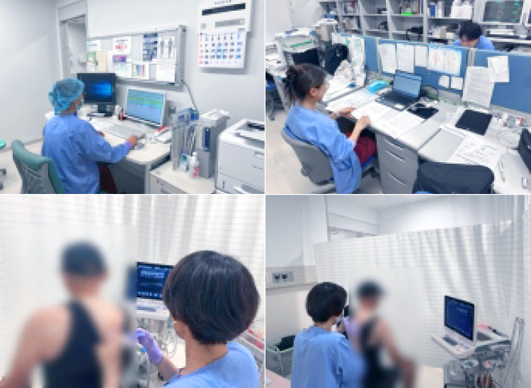 当院では臨床検査技師も研修に参加。経食道心エコーの指導を受けることができます。
