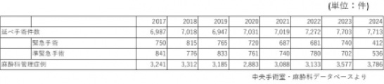 聖隷三方原病院の2024年度の中央手術室における手術件数は7,713例であり、そのうち948例が予定外手術(緊急・准緊急手術)であった。麻酔科医はそのうち3,546例の麻酔および周産期管理を行なった。麻酔科医は、自らの知識・技術の向上はもちろん、増加する重症症例において安全性を損なうことなく患者さんおよび外科医の要求に速やかに対応できるよう努力している。