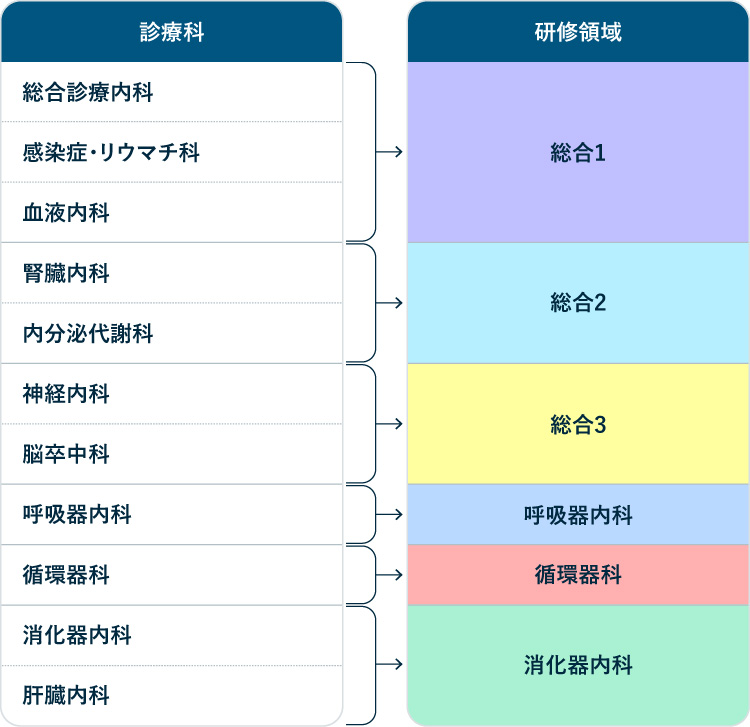 内科総合コースⅠ、Ⅱ及び、内科サブスペシャルティコースⅠ、Ⅱから構成されており、いずれのコースにおいても、内科専門医を目指すために十分な症例経験ができるよう考慮されています。基幹施設である聖隷三方原病院においては、各内科系診療科を6領域に分け、総合1(総合診療内科、感染症・リウマチ内科、血液内科)、総合2(腎臓内科、内分泌代謝科)、総合3(神経内科、脳卒中科)、呼吸器内科、循環器科、消化器内科(肝臓内科含む)の領域を順次経験していただきます。