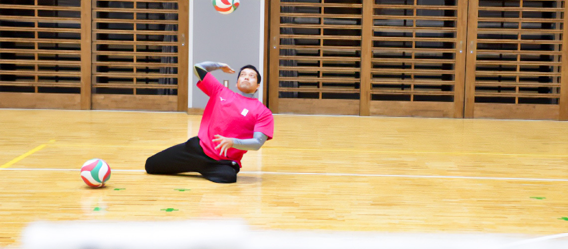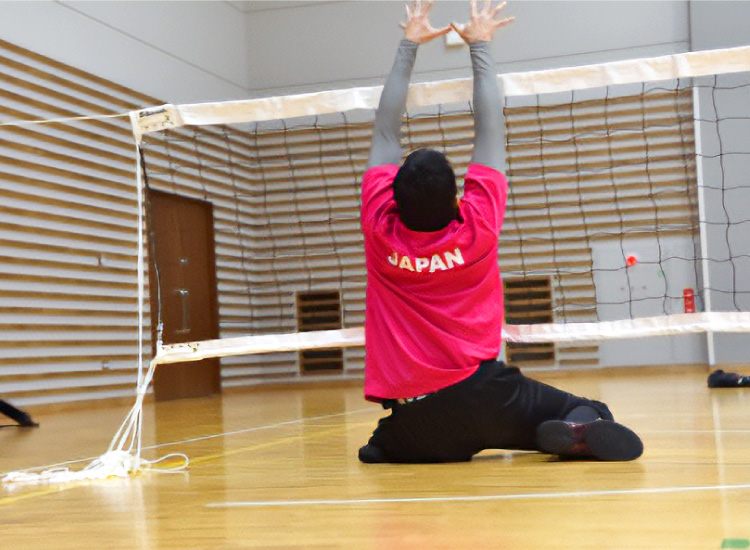 座ってプレーするバレーボール。でん部が床についたまま競技を行います。スピード感あふれるラリーやコンビネーションを駆使した戦略的な戦い方が魅力のスポーツです。