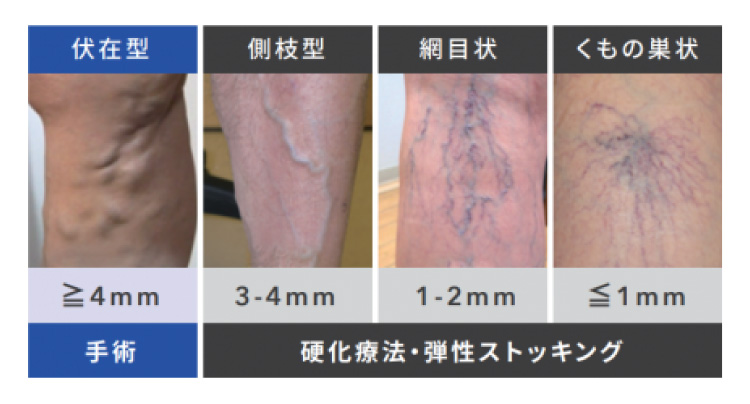 | 保存的治療 | 運動・マッサージなどによる生活習慣の改善や弾性ストッキングの着用など | メスや針を使用しない | 根本的な治療ではない | |||