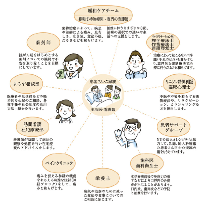多くの職種が協力して診療します。苦痛を和らげることに加え、お一人お一人のライフステージ、就学、就労、経済状況、ご家族との関係性など、患者さんとご家族にとって大切な問題について、ご本人のご希望をふまえて配慮・支援をさせていただきます。