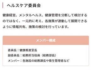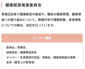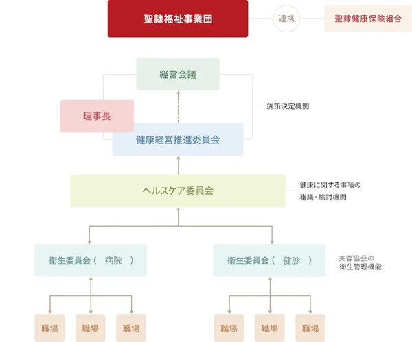 一般財団法人芙蓉協会では、聖隷福祉事業団が整備した健康経営、ヘルスケア推進体制のもと活動しています。健康保険組合と連携し意思決定機関である経営会議、健康経営推進委員会、ヘルスケア委員会と連携して各職場での活動につなげています。