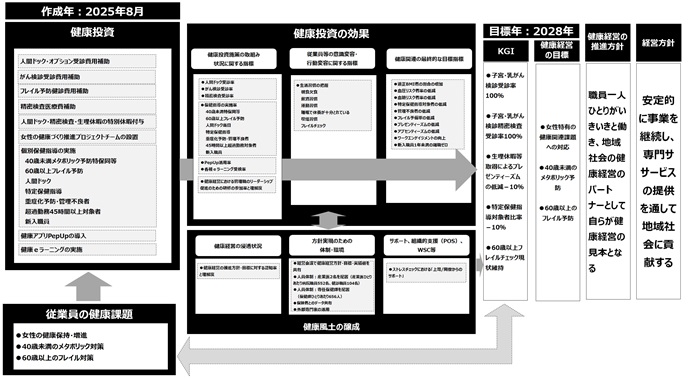 私たちは医療・保健・在宅の3事業を安定的に継続し、専門サービスの提供を通して地域社会に貢献することを使命としています。そのためには、職員一人ひとりがいきいきと働き地域社会の健康経営のパートナーとして自らが健康経営の見本となることが必要と考えています。健康経営の取り組みを経営戦略と連動する戦略マップを作成しました。