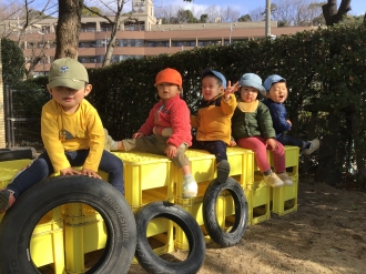 夕方、吹き抜けに出る前にわらべうたや手遊びをしています。「手を繋ごう」のわらべうたを輪になりみんなで手を繋いで楽しみます。毎日する中で子どもたちが自然と輪になり、友だちと手を繋ごうとする姿が見られています。輪になることで友だちの顔が見渡せ、手を繋ぐことで人の温もりを感じられますね。