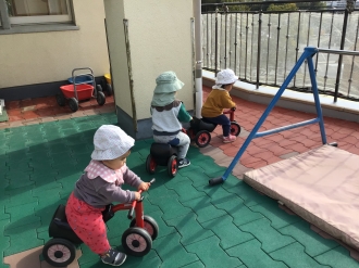 三輪バイクにスムーズに乗れるようになりました。お友だちが出発すると自然と連なって進んでいきます。